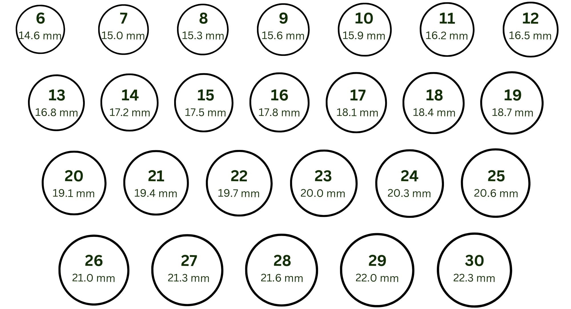 You now have the circumference of your ring, use the following chart to determine your ring size. When in doubt, move up a size.